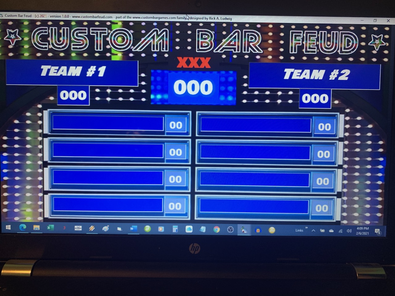 (c) 2021-2024 CustomBarFeud. All rights reserved. CustomBarFeud was created by Showtime Entertainment of Des Moines, IA. Contact us by texting/calling 515-208-1782 Part of the CustomBarGames family of bar entertainment fun!!! |