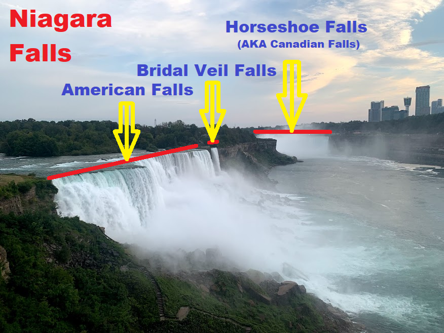 Niagara Falls is made up of 3 falls... American Falls, Bridal Veil Falls & Horseshoe Falls (aka Canadian Falls) American Falls (close up) Bridal Veil Falls (close up) Horseshoe (Canadian) Falls (close up) Niagara Falls at Night!!! From Canada Side From Skylon Tower on Canada Side!!! VIEW MORE PHOTOS OF NIAGARA FALLS DURING DAY & NIGHT (TRIPS #1 & #2) VIEW MORE PHOTOS OF NIAGARA FALLS AND FROM CANADA SIDE (TRIP #3) Location: Niagara Falls, NY GOOGLE MAP (visitor's center) Date visited: 8/29/2021 & 9/3/2022 & 5/3/2024